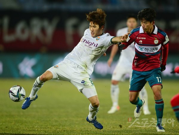 8일 대전 한밭종합운동장에서 열린 ‘하나원큐 K리그 승강 플레이오프 2021’ 1차전 대전 하나시티즌과 강원FC의 경기에서 강원 한국영이 대전 이현식을 피해 패스하고 있다.