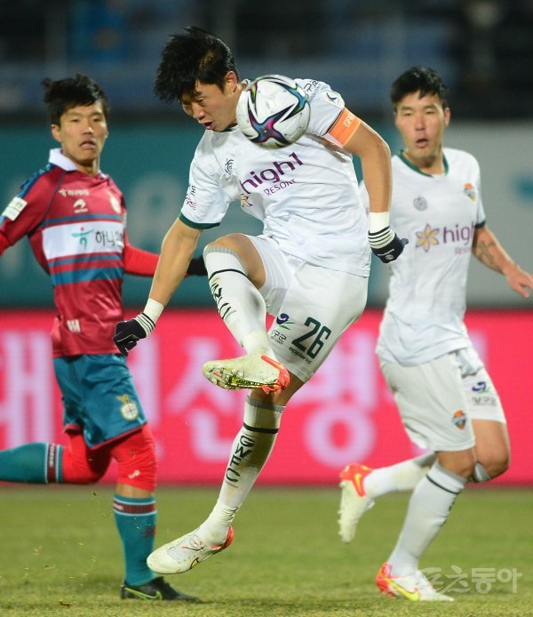 8일 대전 한밭종합운동장에서 열린 ‘하나원큐 K리그 승강 플레이오프 2021’ 1차전 대전 하나시티즌과 강원FC의 경기에서 강원 임채민이 슈팅을 하고 있다.