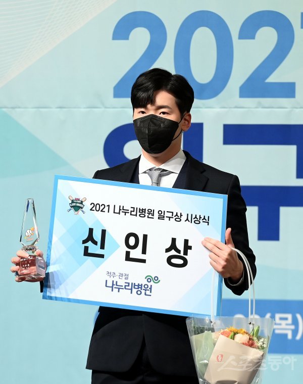 9일 서울 청담 리베라호텔에서 열린 ‘2021 일구상 시상식’에 참석한 롯데 최준용이 신인상을 수상한 뒤 기념촬영을 하고 있다.