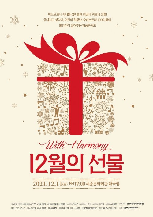 12월 11일 오후 5시, ‘선물 증정’의 장소는 세종문화회관 대극장이다. ‘위드 코로나 위드 하모니 12월의 선물(제작 에이비씨코퍼레이션)’이라는 주제의 의미 있는 공연이다.