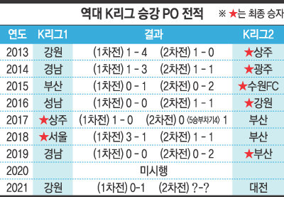 2017년 상주와 2018년 서울은 1부 팀이 살아남은 케이스다. 상주는 1차전에서 부산을 1-0으로 물리친 뒤 2차전에서 0-1로 패해 동률을 이뤘고, 승부차기에서 5-4로 간신히 이겼다. 이듬해 서울도 부산과 맞붙었는데, 역시 1차전 3-1 승리가 발판이 되어 잔류에 성공했다. 당시 서울 사령탑이 현재 강원을 이끌고 있는 최용수 감독이다. 최 감독은 3년 만에 또 다시 피 말리는 전쟁을 벌이고 있다.