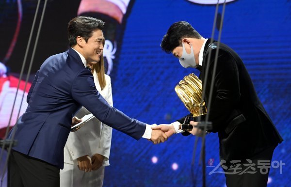 ‘2021 신한은행 SOL KBO리그’ 골든글러브 시상식이 10일 서울 코엑스 오디토리움에서 개최됐다. 지명타자 부문 골든들러브를 수상한 NC 양의지가 홍성흔의 축하를 받고 있다.