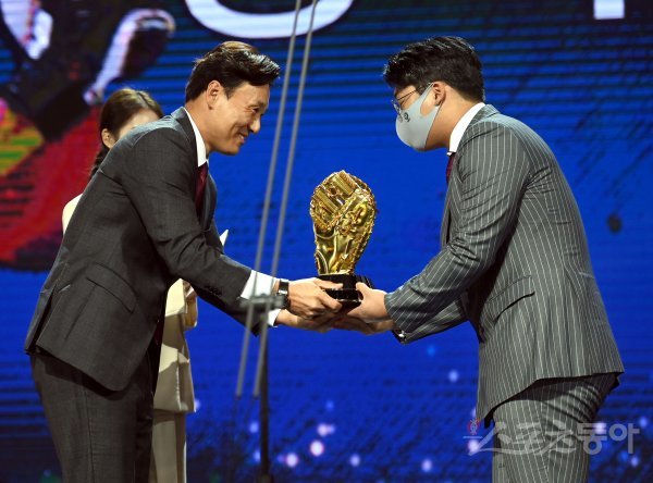 ‘2021 신한은행 SOL KBO리그’ 골든글러브 시상식이 10일 서울 코엑스 오디토리움에서 개최됐다. 1루수 부문 골든들러브를 수상한 KT 강백호가 이승엽 KBO 홍보대사의 축하를 받고 있다. 김종원 기자 won@donga.com