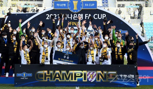 11일 대구 DGB대구은행파크에서 열린 ‘2021 하나은행 FA CUP’ 대구 FC와 전남 드래곤즈의 결승 2차전 경기에서 전남이 우승을 차지한 뒤 기념촬영을 하고 있다.