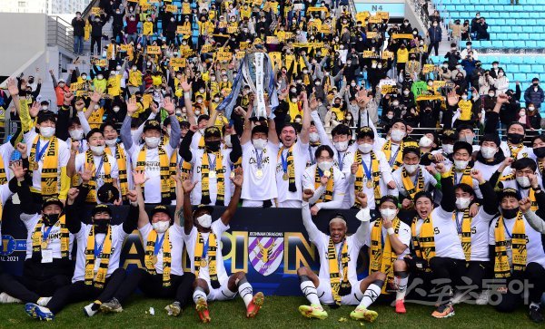 11일 대구 DGB대구은행파크에서 열린 ‘2021 하나은행 FA CUP’ 대구 FC와 전남 드래곤즈의 결승 2차전 경기에서 전남이 우승을 차지한 뒤 기념촬영을 하고 있다.