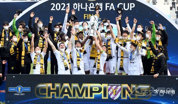 11일 대구 DGB대구은행파크에서 열린 ‘2021 하나은행 FA CUP’ 대구 FC와 전남 드래곤즈의 결승 2차전 경기에서 전남이 우승을 차지한 뒤 기념촬영을 하고 있다.