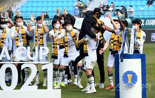 11일 대구 DGB대구은행파크에서 열린 ‘2021 하나은행 FA CUP’ 대구 FC와 전남 드래곤즈의 결승 2차전 경기에서 전남이 우승을 차지한 뒤 지도자상을 수상한 전경준 감독이 선수들의 축하를 받고 있다.