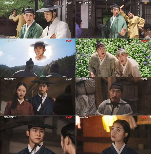 산채 근처에서 불법 초오밭을 발견한 이언은 박태서(이재균 분)와 세자 사망 사건의 연결고리를 확신했다. 백귀령 입구를 찾는 동안, 육칠과 구팔에게 초오밭의 크기를 잴 것을 지시한 이언. 그러나 눈에 채 담을 수도 없을 만큼 큰 밭의 크기는 시작부터 두 사람을 경악하게 했다. 이언이 떠난 자리, 육칠은 하늘을 향해 “도대체 저희한테 무슨 원한을 지셨습니까?”라고 외쳤다. 이에 응답하듯 청명한 하늘에 이언의 얼굴이 햇살처럼 떠올랐다. 육칠과 구팔의 볼멘소리를 상큼한 미소로 넘겨버린 이언은 “쉬엄쉬엄 최대한 빨리 끝내고”라는 말만 남긴 채 사라졌고, 분노한 두 사람의 모습은 폭소를 유발했다. ‘어사토비’ 이언의 친숙한 비주얼에 더해진 ‘라육구’(라이언X육칠X구팔)의 능청스러운 티키타카가 웃음 짓게 했다.