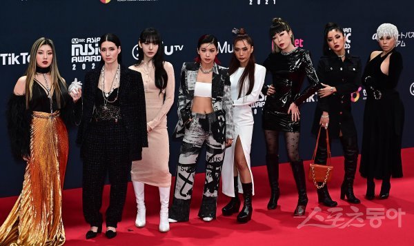 스트릿우먼파이터 8크루 리더들이 11일 경기도 파주 CJ ENM 스튜디오 센터에서 열린 ‘2021 MAMA(Mnet 아시아 뮤직 어워즈)’ 레드카펫에서 포즈를 취하고 있다.