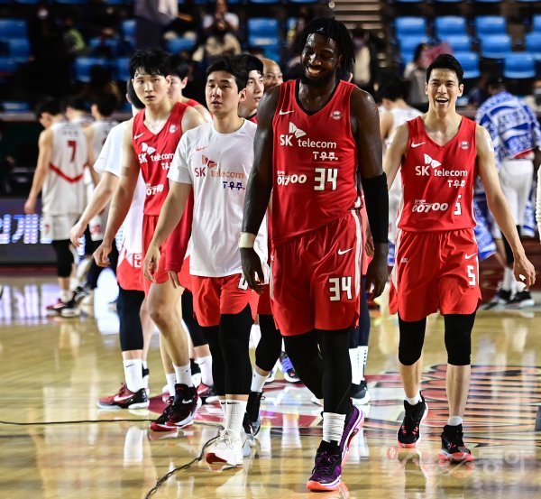 12일 서울 잠실학생체육관에서 열린 ‘2021-2022 KGC 인삼공사 정관장 프로농구’ 서울 SK와 울산 현대모비스의 경기에서 현대모비스에 88-77로 승리를 거둔 SK 선수들이 기뻐하고 있다.