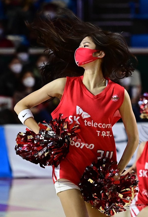 12일 서울 잠실학생체육관에서 열린 ‘2021-2022 KGC 인삼공사 정관장 프로농구’ 서울 SK와 울산 현대모비스의 경기에서 SK 박기량 치어리더가 공연을 펼치고 있다.