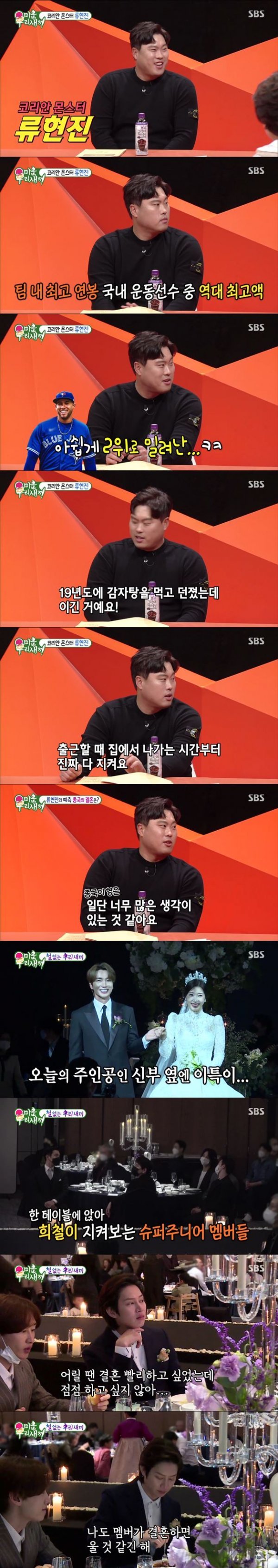 이날 김희철은 슈퍼주니어 이특 누나의 결혼식에 사회자로 나서 눈길을 끌었다. 이에 류현진은 자신의 결혼식에 사회는 유재석이, 축가는 김종국이 불렀다고 말해 관심을 모았다. 특히, 아내 배지현 아나운서가 “축가로 \'Marry Me\'를 꼭 불러줬으면 좋겠다고 부탁했다”며 “종국이 형이 마지막 소절을 나에게 마이크를 넘긴 거다. 안 그래도 긴장되는데 마이크를 받으니까 목소리가 안 나오더라"고 결혼식 비하인드를 전했다. 또 ‘김종국이 결혼 할 것 같냐?’는 질문에 ‘결혼은 할 것 같다. 하지만 종국이 형은 봄 여름 가을 겨울을 다 만나봐야 한다는 등 일단 생각이 너무 많다”고 말해 폭소를 안겼다.