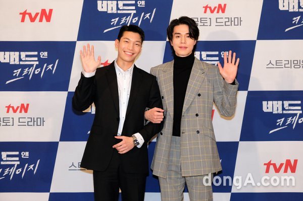 위하준(왼쪽)과 이동욱이 13일 온라인으로 진행된 tvN 새 금토 드라마 ‘배드 앤 크레이지’ 제작발표회에서 포즈를 취하고 있다.