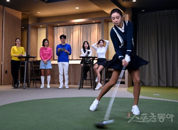 스포츠동아와 빅컬쳐엔터테인먼트가 공동제작하고 골프웨어와 액세서리 등 골프용품을한데 모아 소개하는 SNS 기반 미디어 플랫폼 ‘어반에이트’가 제작지원하는 스포츠동아의 유튜브 채널인 골프 리얼 ‘생’ 토크쇼 ‘스동골프TV 일파만파’가 새로운 콘텐츠를 공개한다. 서지우, 이가은, 이은채, 류제희 골퍼들과 이정연 스포츠동아 엔터테인먼트부장·트로트가수 신인선이 함께 골프에 관한 재치있는 입담을 펼친다. 서울 용산구 프렌즈 아카데미 한남에서 진행된 일파만파 촬영장에서 가수팀 이가은이 골프를 선보이고 있다.