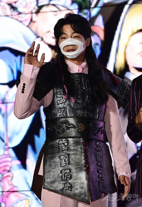 가수 신사마가 14일 서울 종로구 동대문JW메리어트 호텔에서 열린 TV CHOSUN 새 예능프로그램 ‘부캐전성시대’ 제작발표회에서 포즈를 취하고 있다.