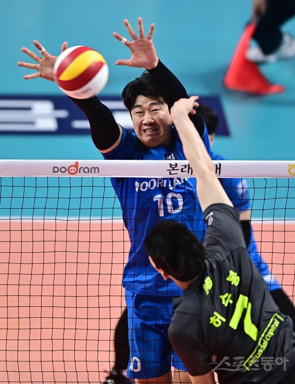 14일 서울 장충체육관에서 열린 ‘2021~2022 도드람 V-리그’ 남자부 서울 우리카드와 천안 현대캐피탈의 경기에서 우리카드 나경복이 블로킹을 하고 있다.