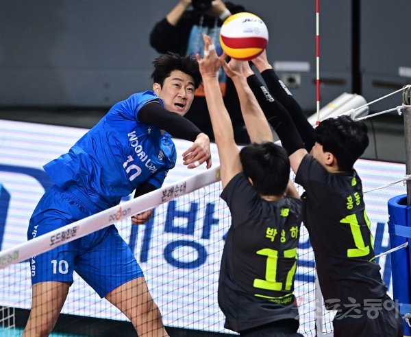 14일 서울 장충체육관에서 열린 ‘2021~2022 도드람 V-리그’ 남자부 서울 우리카드와 천안 현대캐피탈의 경기에서 우리카드 나경복이 현대캐피탈 블로커 위로 스파이크를 때리고 있다.