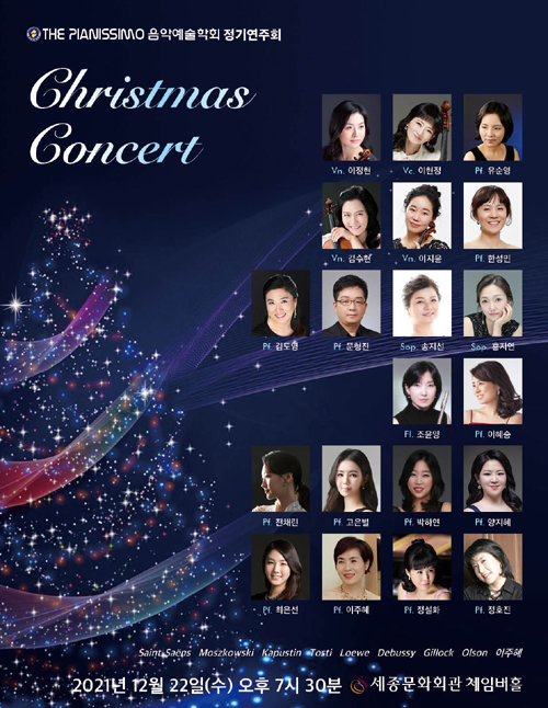 The Pianissimo 음악예술학회의 정기연주회가 12월 22일 오후 7시 30분 세종문화회관 체임버홀에서 열린다. 연말, 크리스마스 시즌을 맞아 마련한 ‘크리스마스 콘서트’다.-음악 전 분야에 걸쳐 연주와 학술활동…역량있는 국내외 음악인들 참여