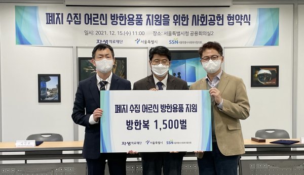 생의료재단은 15일 서울시와 폐지 수집 어르신들을 위한 방한용품 지원 업무협약(MOU)를 체결했다.서울시청에서 협약식에는 자생의료재단 신민식 사회공헌위원장과 서울시 하영태 복지정책과장, 서울사회복지협의회 이인규 센터장 등이 참석했다. 협약식 이후 어르신 방한복 기부전달식도 함께 진행했다.