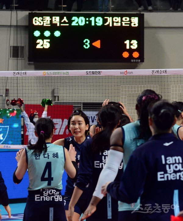 15일 서울 장충체육관에서 ‘2021-2022 도드람 V리그’ 서울 GS칼텍스와 화성 IBK기업은행의 여자부 경기가 열렸다. GS칼텍스가 IBK기업은행을 상대로 세트스코어 3-0으로 승리한 뒤 선수들이 기쁨을 나누고 있다.