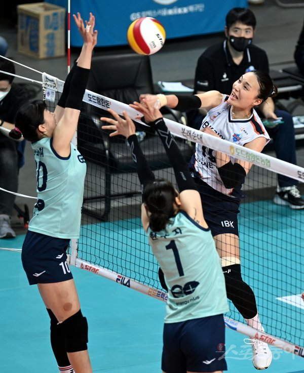 15일 서울 장충체육관에서 ‘2021-2022 도드람 V리그’ 서울 GS칼텍스와 화성 IBK기업은행의 여자부 경기가 열렸다. IBK기업은행 표승주가 GS칼텍스 블로커를 피해 스파이크를 날리고 있다.