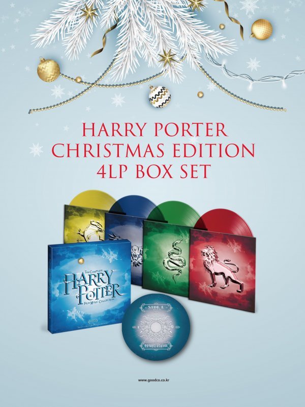 해리 포터 크리스마스 에디션 박스세트4LP는 8편의 모든 영화에서 선곡한 33개 트랙을 담았다. 해리 포터 호그와트 4대 가문으로 불리는 ‘그리핀도르’, ‘래번클로’, ‘후플푸프’, ‘슬리데린’ 문양을 커버로 장식한 4장의 LP는 빨강, 파랑, 노랑, 초록으로 구성된 컬러반이다.
