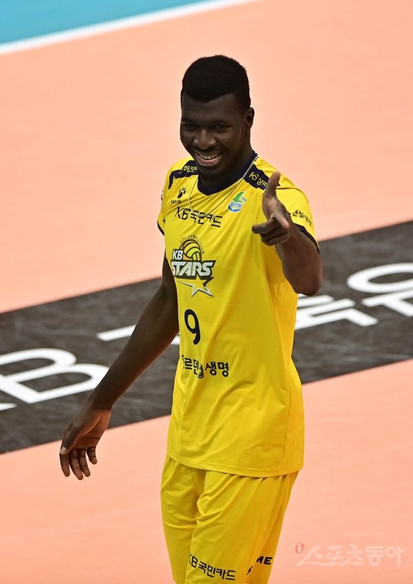 19일 의정부체육관에서 열린 ‘2021~2022 도드람 V-리그’ 남자부 의정부 KB손해보험과 인천 대한항공의 경기에서 KB손해보험 케이타가 연속 서브 득점 성공에 세리머니를 하고 있다.