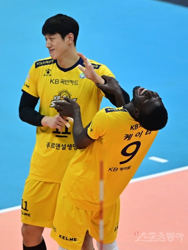 19일 의정부체육관에서 열린 ‘2021~2022 도드람 V-리그’ 남자부 의정부 KB손해보험과 인천 대한항공의 경기에서 KB손해보험 케이타가 득점에 성공한 후 김홍정과 기쁨을 나누고 있다.