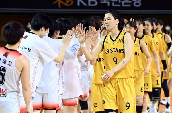 20일 충북 청주실내체육관에서 열린 ‘삼성생명 2021-2022 여자프로농구’ 청주 KB스타즈와 부산 BNK 썸의 경기에서 KB스타즈가 BNK 썸을 상대로 85-72로 승리한 뒤 양 팀 선수들이 인사를 나누고 있다.