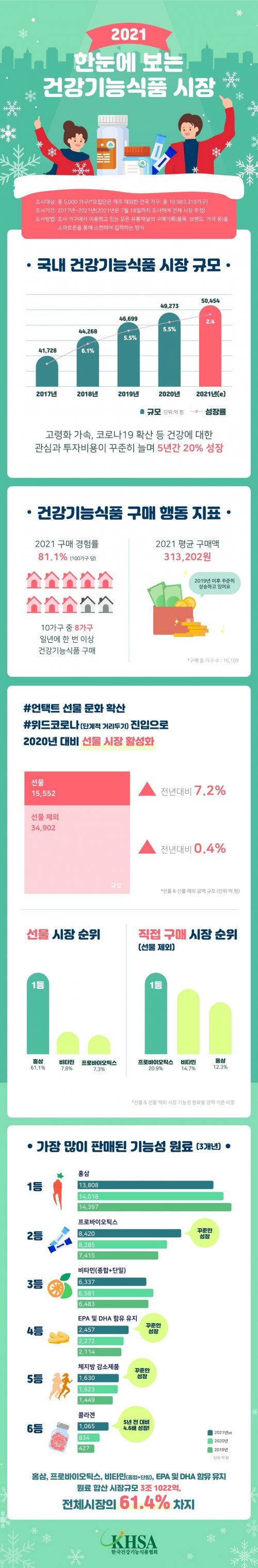 국내 건강기능식품(이하 건기식) 시장 규모가 5조 원을 넘어선 것으로 조사됐다. 5년 전인 2017년과 비교하면 20% 이상 커졌다.구매 경험 81.1%, 평균 구매액 31만 원 등