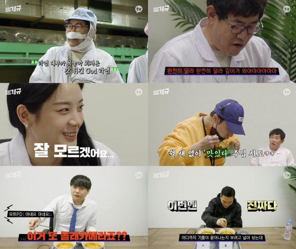 공장에서 라면 생산 과정을 직접 살펴보던 이경규는 갓 튀겨져 나온 따끈따끈한 면을 보고 흥분하며 포장도 하지 않은 생라면을 열심히 챙기는 진짜 텐션을 뽐내는가 하면, 직접 라면 끓이기에 나서 못 말리는 라면 사랑으로 침샘과 웃음샘을 동시에 자극한다. 직접 끓인 라면을 맛보며 “다르지 않아? 완전 다르지”라며 쉴새 없이 서라운드 라면 찬양을 펼치던 이경규는 장규리가 “전혀 다른지 모르겠다”라고 솔직하게 대답하자 당황하더니, 제작진까지 시식에 동참시키며 갓라면에 대한 무한 믿음을 주입시켜 폭소를 유발한다.