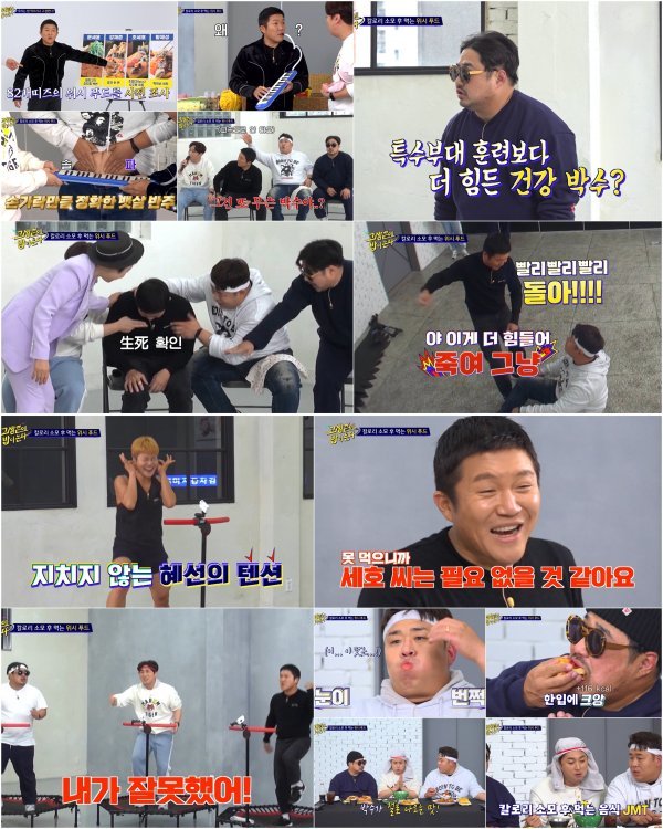 하루 종일 고생한 끝에 자신의 소울푸드인 김치찜을 맛본 문세윤은 “천국 간다. 날이 청명한 하늘 아래 공원을 걷는 느낌이다”라며 감성적인 맛 표현에 빠졌다. 떡튀순 세트에 빠진 황제성은 “이게 너무 먹고 싶었다”며 박수갈채를 보냈다. 쌀과 밀가루를 제한하던 강재준은 눈 앞에 피자에 “오늘은 먹겠다”라며 야무지게 피자를 먹어 보는 이들의 군침을 돌게 만들었다. 비록 조세호는 강제 퇴근을 당했지만, 미션 성공자 문세윤 황제성 강재준은 “칼로리 소모하고 먹으니 정말 맛있다”라고 감탄하며 행복한 시간을 보냈다.