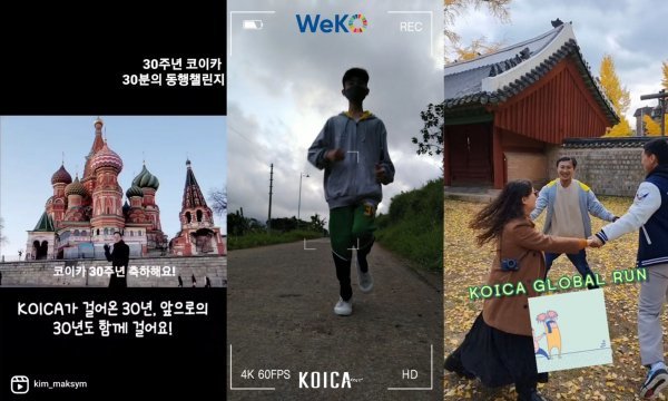 코이카(KOICA, 한국국제협력단)의 ‘30주년 코이카, 30분의 동행 챌린지’ 영상이 주인공이다. 코이카의 국민 서포터즈 ‘위코(WeKO)’ 120명이 모로코, 러시아, 우간다, 유럽 몰타 등 20개국에서 30분 동안 걷는 모습을 담았다. 온라인상 조회수 약 90만 회를 기록해 코이카 홍보영상 중 가장 높은 호응을 받았다.