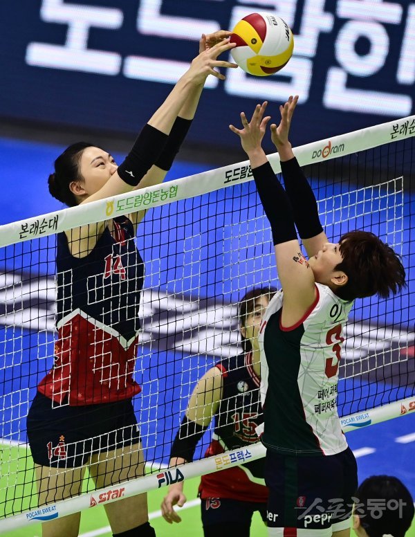 22일 경기도 수원체육관에서 열린 ‘2021~2022 도드람 V-리그’ 여자부 수원 현대건설과 광주 페퍼저축은행의 경기에서 현대건설 양효진이 페퍼저축은행 이현 앞에서 볼을 넘기고 있다.