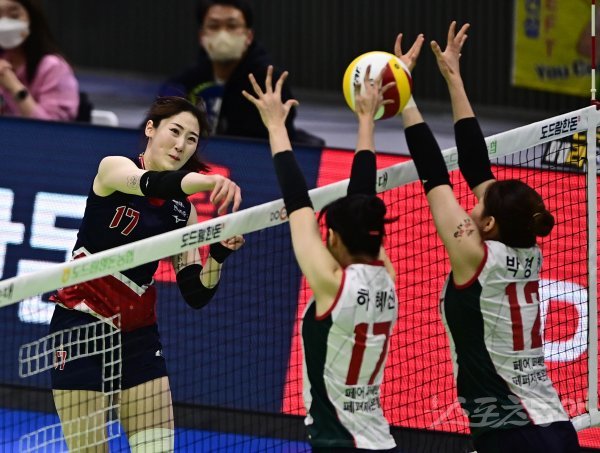 22일 경기도 수원체육관에서 열린 ‘2021~2022 도드람 V-리그’ 여자부 수원 현대건설과 광주 페퍼저축은행의 경기에서 현대건설 고예림이 페퍼저축은행 블로커 사이로 스파이크를 때리고 있다.
