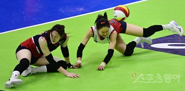 22일 경기도 수원체육관에서 열린 ‘2021~2022 도드람 V-리그’ 여자부 수원 현대건설과 광주 페퍼저축은행의 경기에서 현대건설 김연견과 고예림이 디그 상황에서 부딪히고 있다.