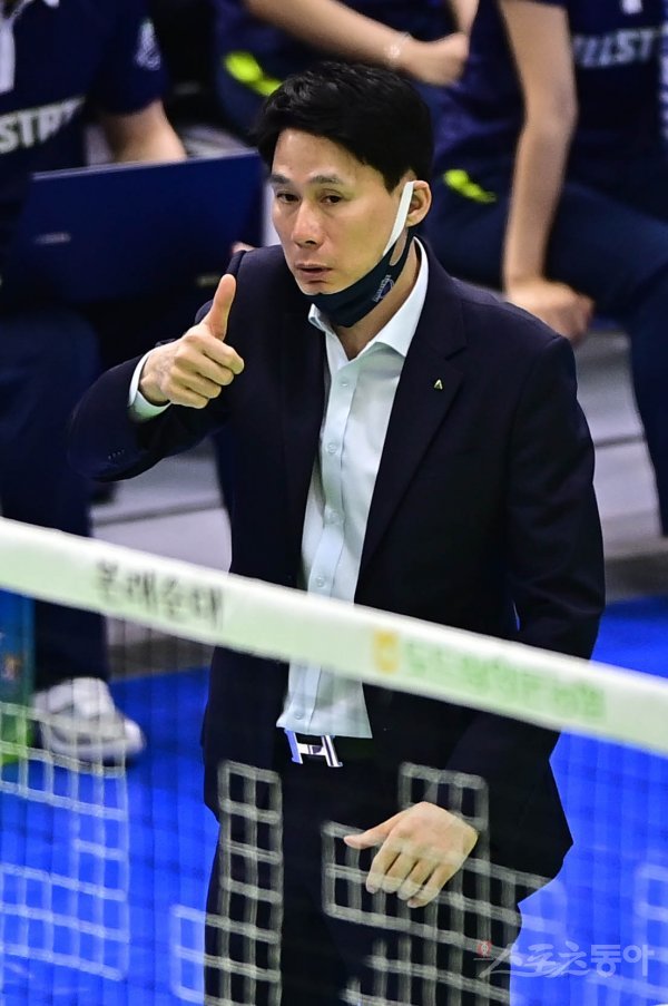 22일 경기도 수원체육관에서 열린 ‘2021~2022 도드람 V-리그’ 여자부 수원 현대건설과 광주 페퍼저축은행의 경기에서 현대건설 강성형 감독이 선수들에게 엄지를 치켜세우고 있다.