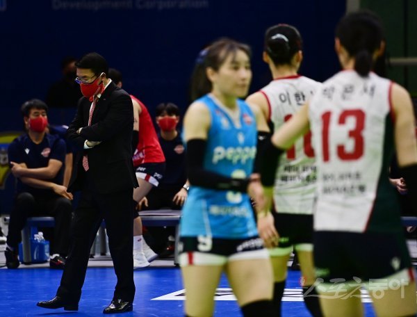 22일 경기도 수원체육관에서 열린 ‘2021~2022 도드람 V-리그’ 여자부 수원 현대건설과 광주 페퍼저축은행의 경기에서 페퍼저축은행 김형실 감독이 생각에 잠겨 있다.