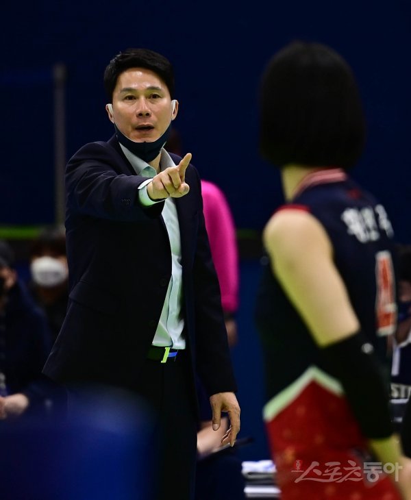 22일 경기도 수원체육관에서 열린 ‘2021~2022 도드람 V-리그’ 여자부 수원 현대건설과 광주 페퍼저축은행의 경기에서 현대건설 강성형 감독이 선수들에게 작전 지시를 하고 있다.