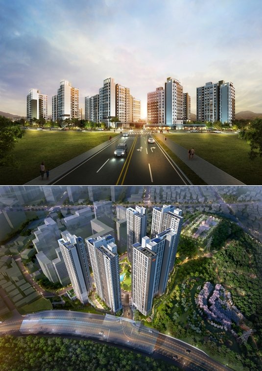 올 연말 나란히 분양에 돌입하는 인천 ‘e편한세상 검단 어반센트로’의 투시도(위쪽)와 의정부 ‘e편한세상 신곡 파크프라임’의 조감도. 올해 출범한 DL이앤씨는 “의미있는 한 해를 마무리하는 분양 단지인 만큼 각 지역을 대표하는 랜드마크가 될 수 있도록 심혈을 기울이겠다”고 밝혔다. 사진제공 | DL이앤씨