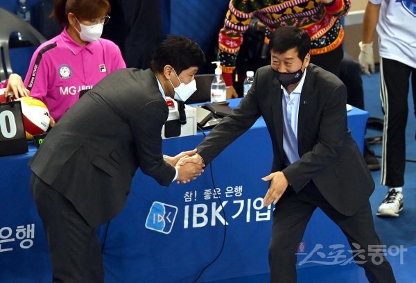 23일 화성종합경기타운 실내체육관에서 열린 ‘2021~2022 도드람 V-리그’ 여자부 IBK기업은행과 한국도로공사 경기에서 IBK기업은행 김호철 감독과 한국도로공사 김종민 감독이 악수를 하고 있다.