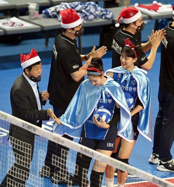 23일 화성종합경기타운 실내체육관에서 열린 ‘2021~2022 도드람 V-리그’ 여자부 IBK기업은행과 한국도로공사 경기에서 IBK기업은행 김호철 감독이 산타 모자를 쓰고 김수지와 하이파이브 하고 있다.