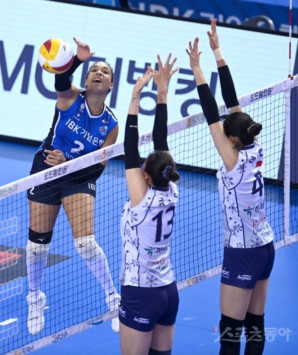 23일 화성종합경기타운 실내체육관에서 열린 ‘2021~2022 도드람 V-리그’ 여자부 IBK기업은행과 한국도로공사 경기에서 IBK기업은행 산타나가 한국도로공사의 블로킹 사이로 스파이크 공격을 하고 있다.