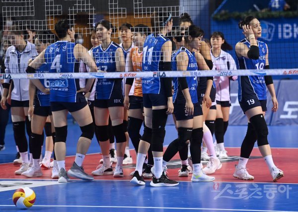 23일 화성종합경기타운 실내체육관에서 열린 ‘2021~2022 도드람 V-리그’ 여자부 IBK기업은행과 한국도로공사 경기에서 세트스코어 2-3 역전패를 당한 IBK기업은행 선수들이 아쉬워하고 있다.