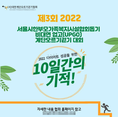 대한계단오르기걷기협회(회장 최완정)가 ‘제3회 서울시한부모가족복지시설협회 비대면 업고(UPGO) 계단오르기걷기 대회’를 개최한다.