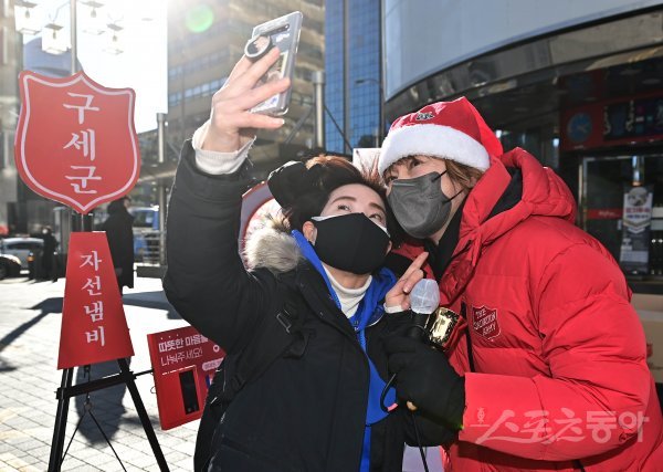 가수 김장훈이 26일 서울 명동역 6번 출구 앞 광장에서 열린 구세군 자선냄비 콘서트 ‘8시간의 기적’에서 팬과 기념 촬영을 하고 있다.