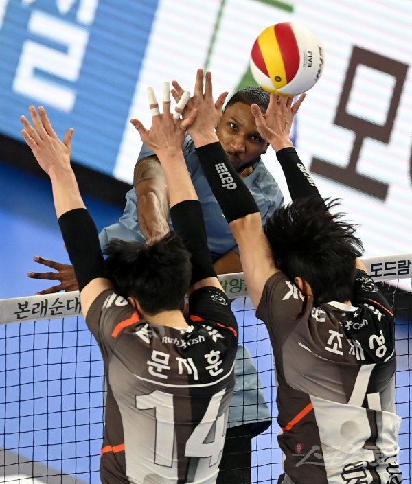 26일 천안 유관순체육관에서 열린 ‘2021~2022 도드람 V-리그’ 남자부 현대캐피탈과 OK금융그룹 경기에서 현대캐피탈 히메네즈가 OK금융그룹의 블로킹 사이로 스파이크를 날리고 있다.