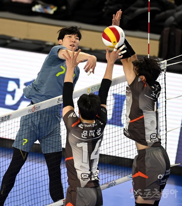 26일 천안 유관순체육관에서 열린 ‘2021~2022 도드람 V-리그’ 남자부 현대캐피탈과 OK금융그룹 경기에서 현대캐피탈 허수봉이 OK금융그룹의 블로킹 사이로 스파이크를 날리고 있다.