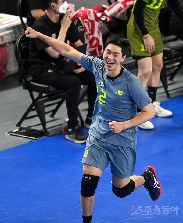 26일 천안 유관순체육관에서 열린 ‘2021~2022 도드람 V-리그’ 남자부 현대캐피탈과 OK금융그룹 경기에서 현대캐피탈 전광인이 블로킹 득점에 성공한 후 환호하고 있다.