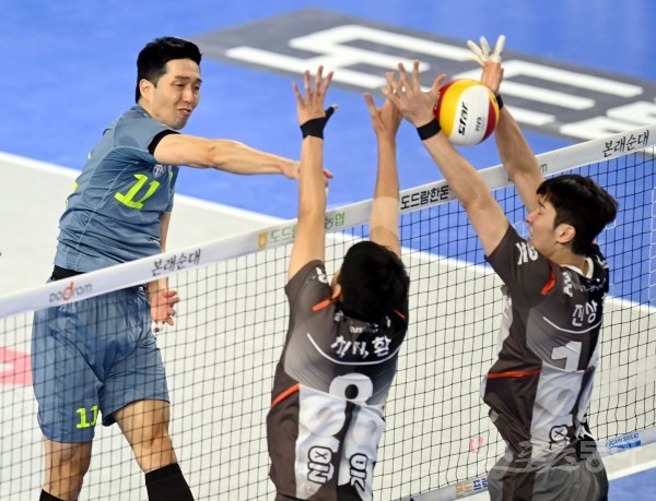 26일 천안 유관순체육관에서 열린 ‘2021~2022 도드람 V-리그’ 남자부 현대캐피탈과 OK금융그룹 경기에서 현대캐피탈 최민호가 OK금융그룹의 블로킹 사이로 스파이크를 날리고 있다.